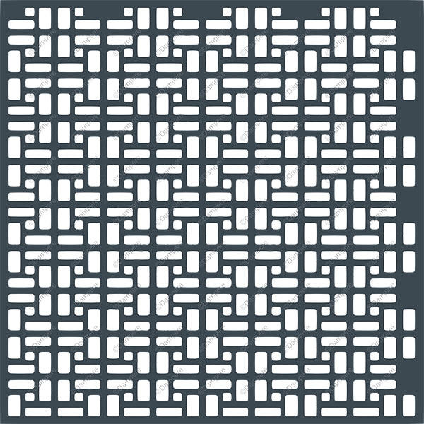 Tôle perforée Lascala composée de larges ouvertures carrées et rectangulaires reconstituant une grille isométrique légèrement désagrégée, ressemblant à une cannage complexe.